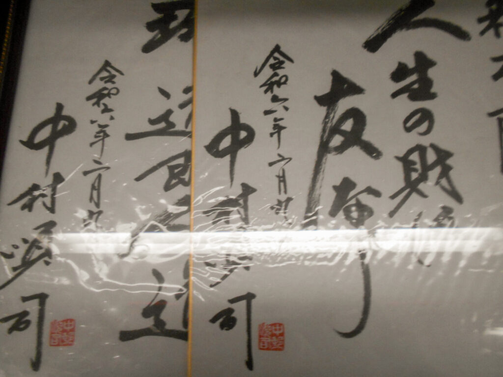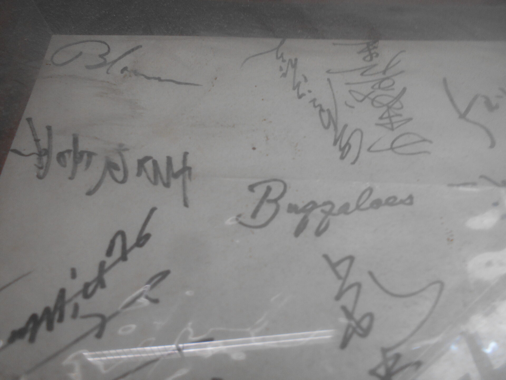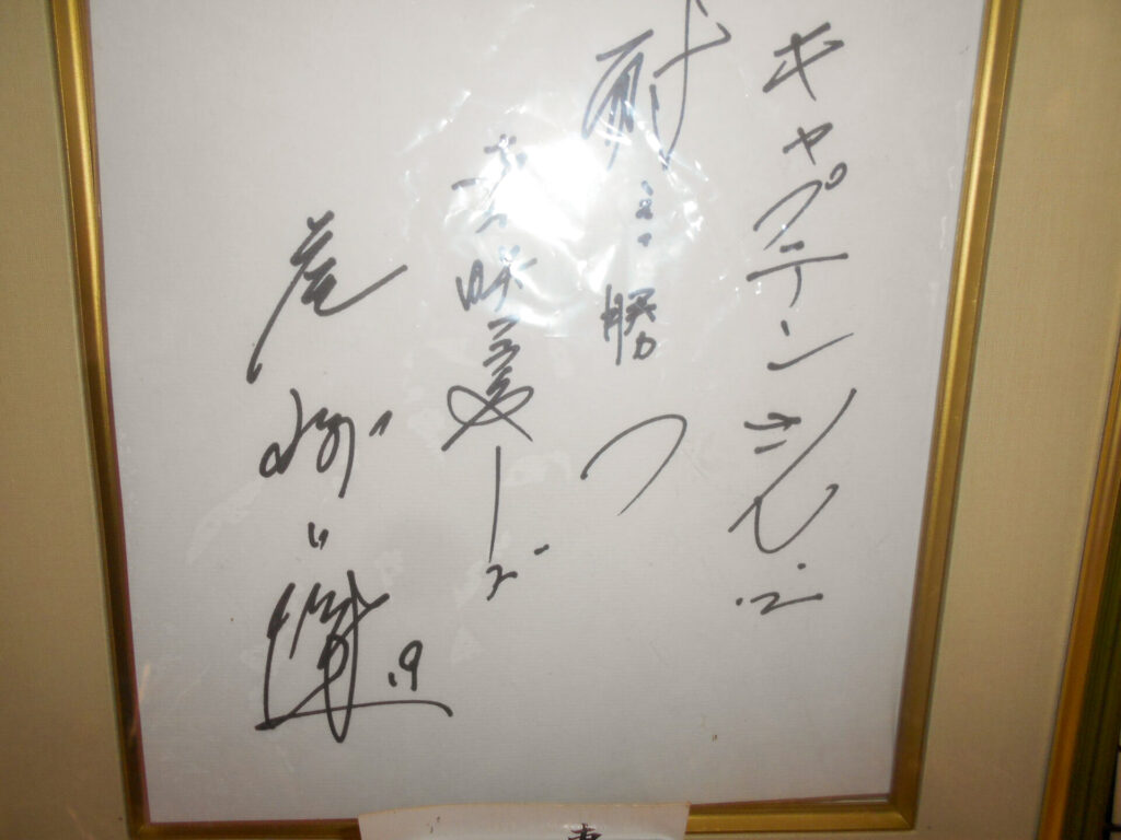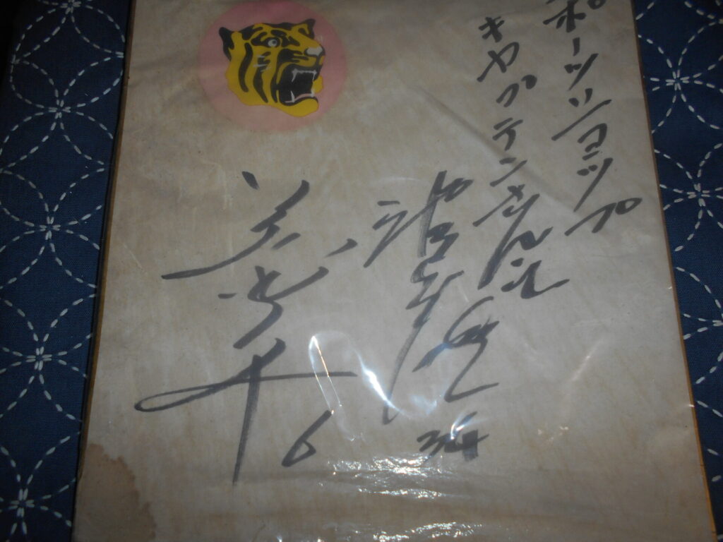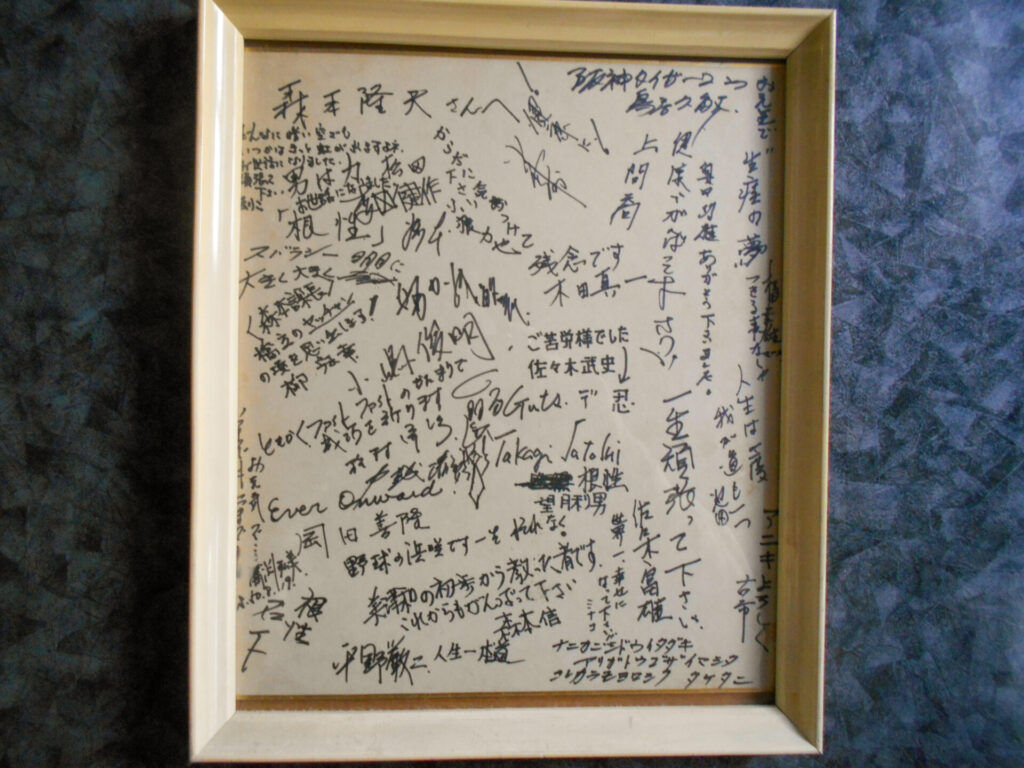 美津和タイガー当時から様々な行事でお世話になった日刊スポーツの当時部長N氏から開店祝いとして同年(1975.7.30)甲子園球場で行った「オールドスター試合」の寄せ書きをいただきました。