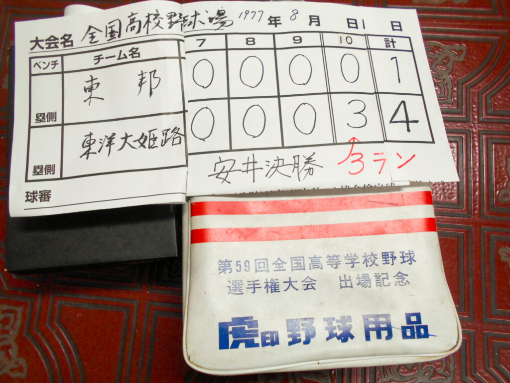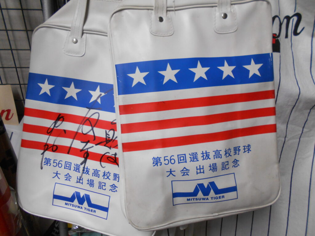 球児の華甲子園選抜、夏の選手権では大会期間中、当美津和タイガーは参加する選手達の用具サービスを球場内の一角でホローを任されて協力していました。又出場選手(当時1チーム14名)に参加賞として配布(写真選抜大会桑田氏、清原氏2年生準優勝時のもの中村監督サインと、夏の選手権過去初めて東洋大姫路決勝サヨナラ3ラン時バッグです。安井氏(現)SSK部長)