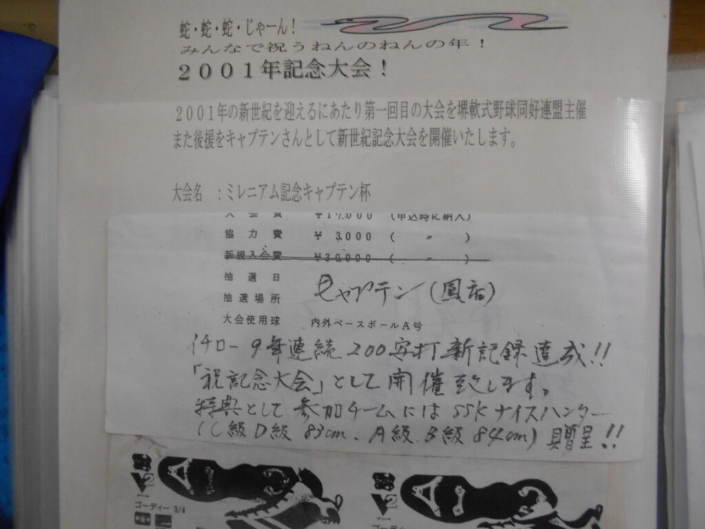 予算があればミット、バット、バック、ボール、コート等参加チームへ配布できたのも皆さんの協力のお陰です。最大のイベントイチローMLB時白いスパイク旋風12足セットを希望チームに買っていただき翌年には全チームへ各5足ずつ(500足)ご提供できたのは商売抜きにしてセールス冥利に尽きます。(100チーム)の大所帯だった故でしょうか…
